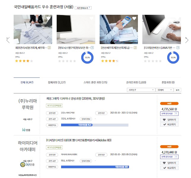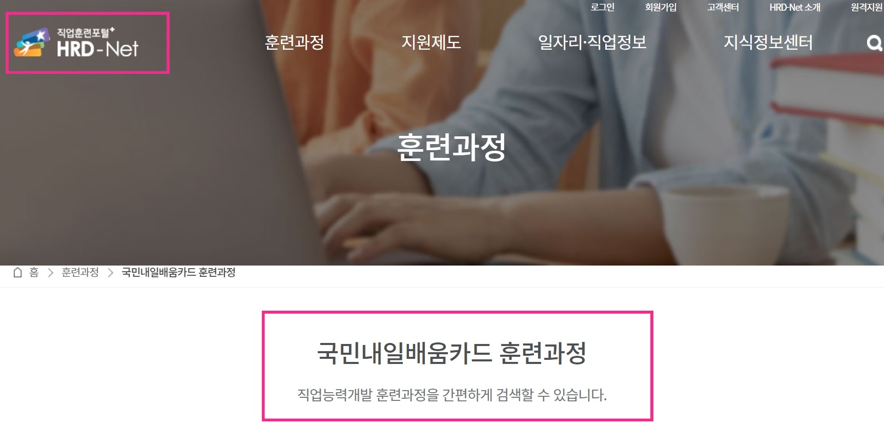 고용노동부에서 운영하고 있는 직업훈편포털 사이트인 HRD-Net 홈페이지에 가시면 훈련과정- 국민 내일 배움 카드 훈련과정 메뉴에서 간편한 검색으로 본인이 원하는 교육기관을 찾아볼 수 있습니다.
