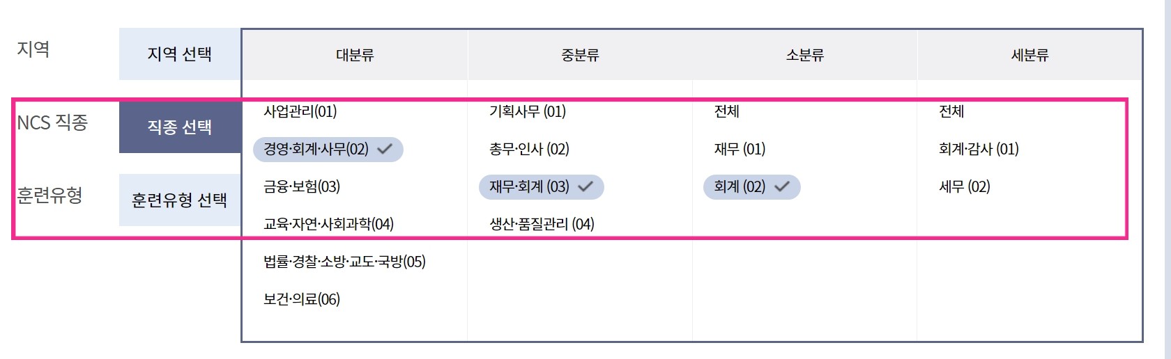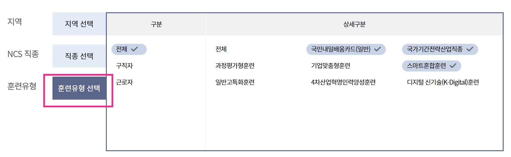 원하는 지역, 직종, 훈련유형 중 대분류에서 중소 분류와 상세구분으로 원하는 강의를 검색할 수 있습니다.