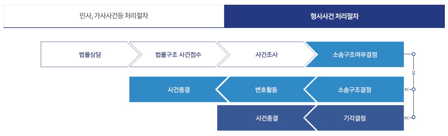 - 법률상담, 변호사 또는 공익법무관에 의한 소송대리 및 형사변호 등의 법률적 지원을 통하여