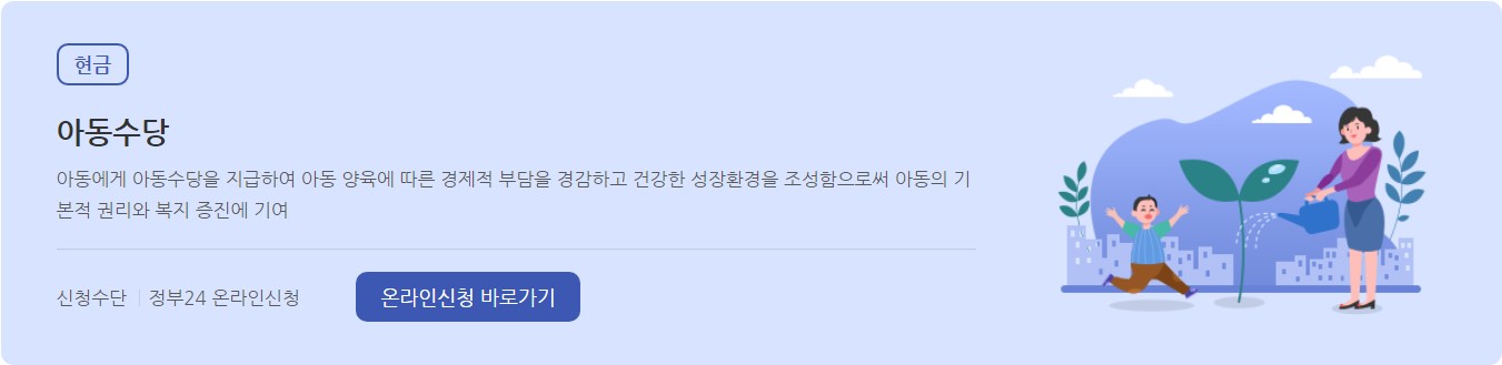 숨은 정부지원금 찾기_보조금 24 결과인 지원 혜택 중 하나인 '아동수당'을 클릭해 봤습니다.