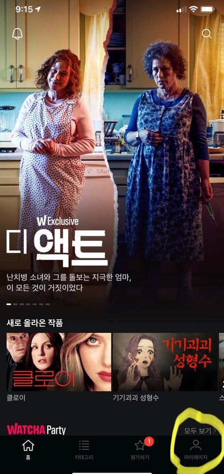 왓챠 하단에 '마이페이지'를 클릭합니다.