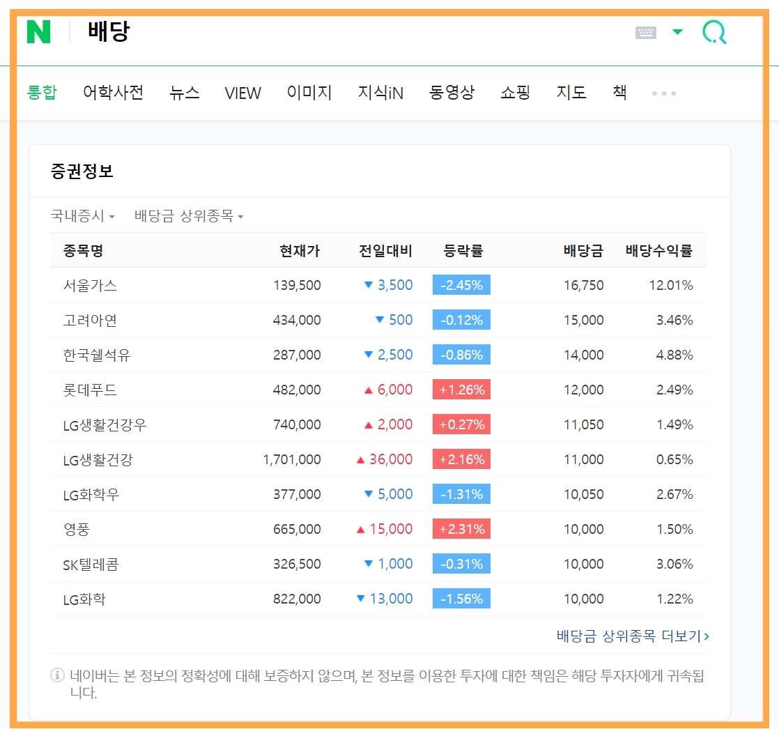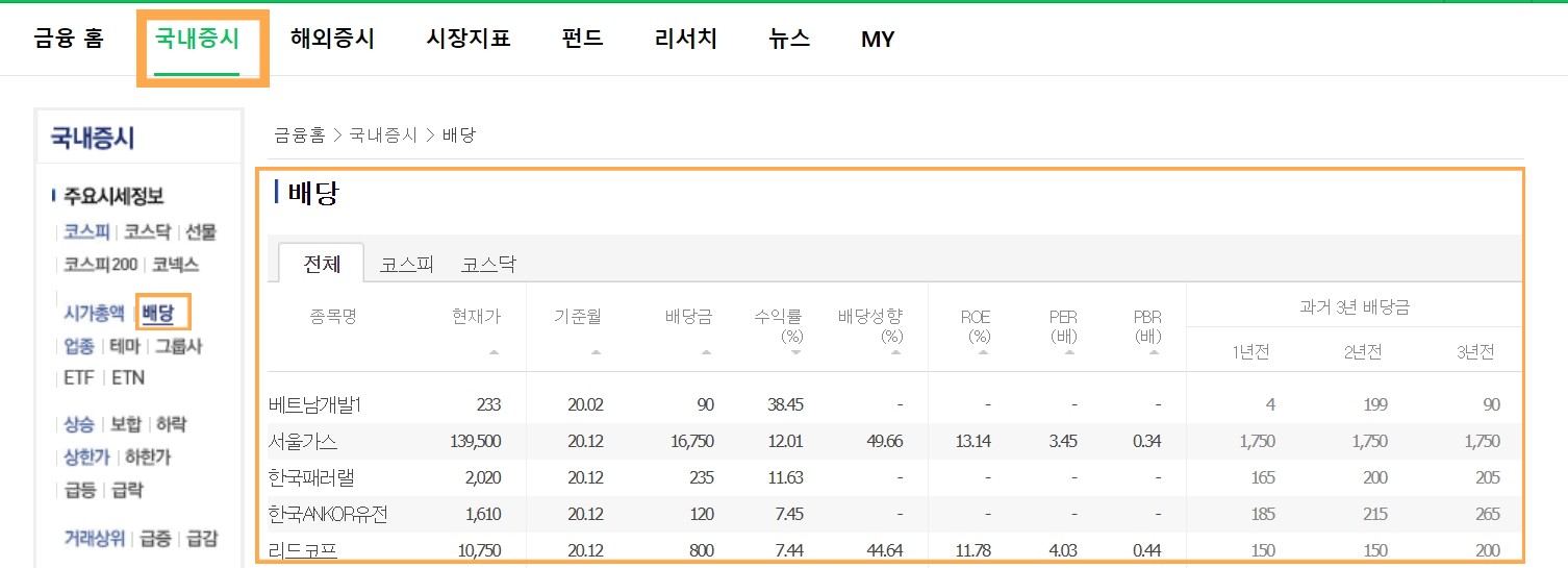 네이버 금융 > 국내증시 > 배당