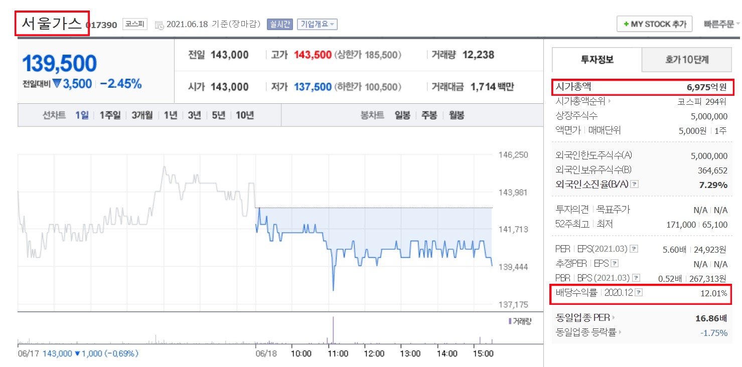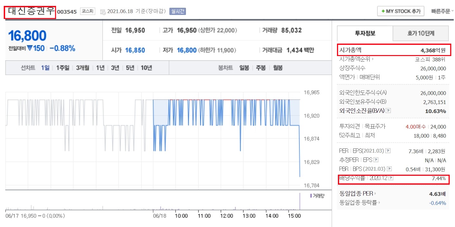 투자 정보에서 시가총액을 확인하시고 배당수익률이 5% 이상인 기업을 선택하셔야 합니다.