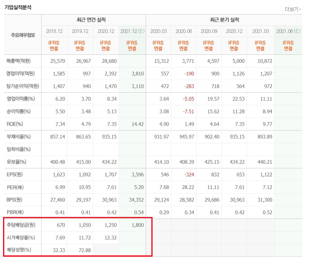 해당 페이지 하단으로 가면 기업실적 분석표에서 최근 3년간 주당 배당금과 배당률을 확인할 수 있습니다.