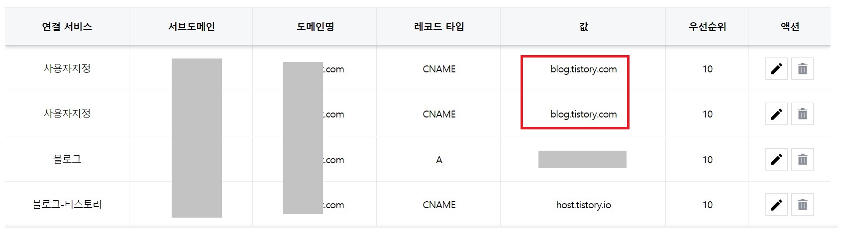 나머지 서브 도메인 주소는 계속 오류가 나서 'blog.tistory.com'으로 설정값을 바꿔봅니다.