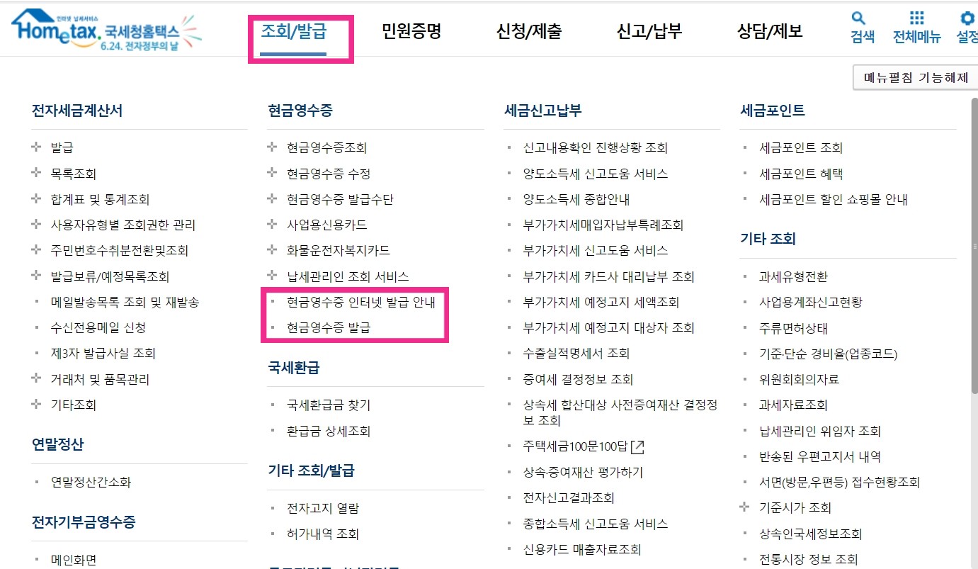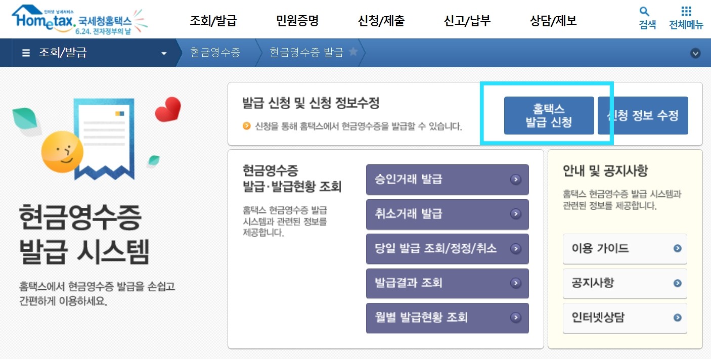 ◆ 국세청 홈택스 > 조회/발급> 현금영수증 발급을 선택합니다.