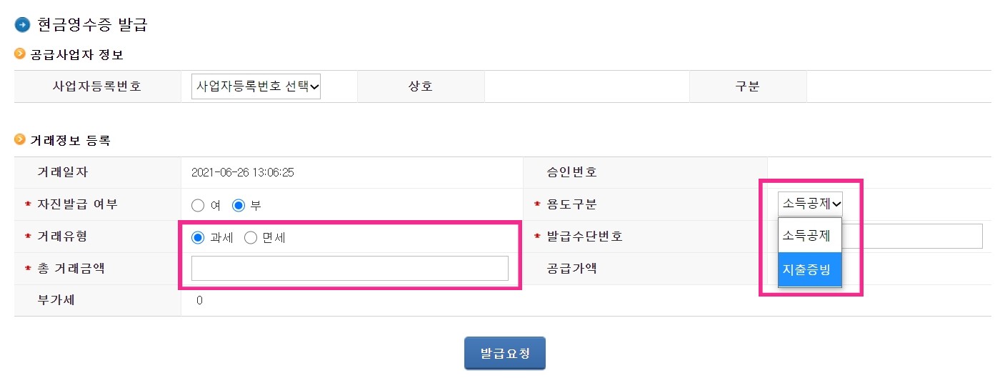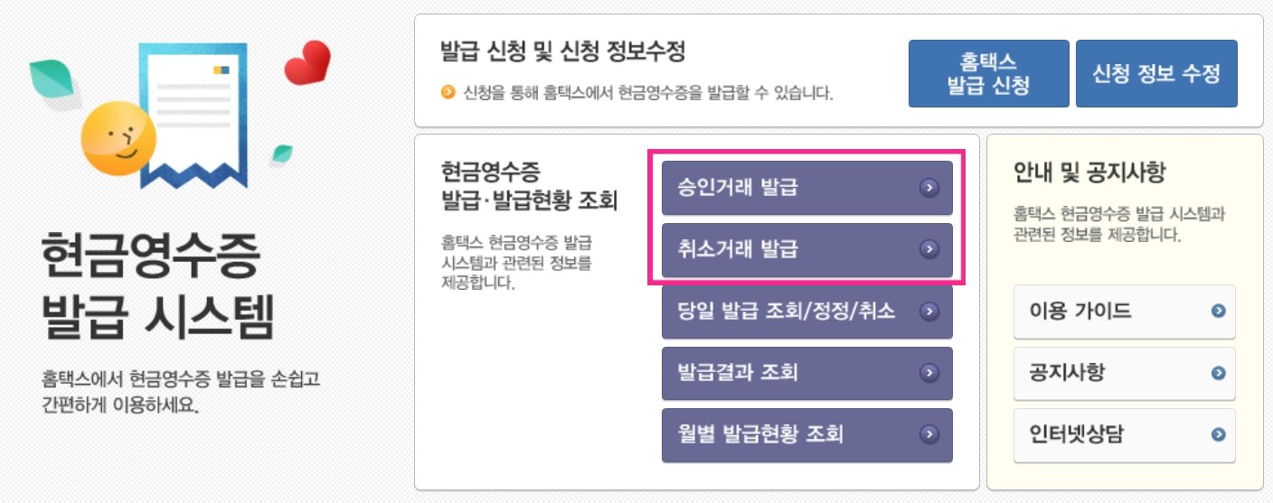- 현금영수증 발급시스템 [승인거래 발급]에서 현금영수증 발급이 가능합니다.
