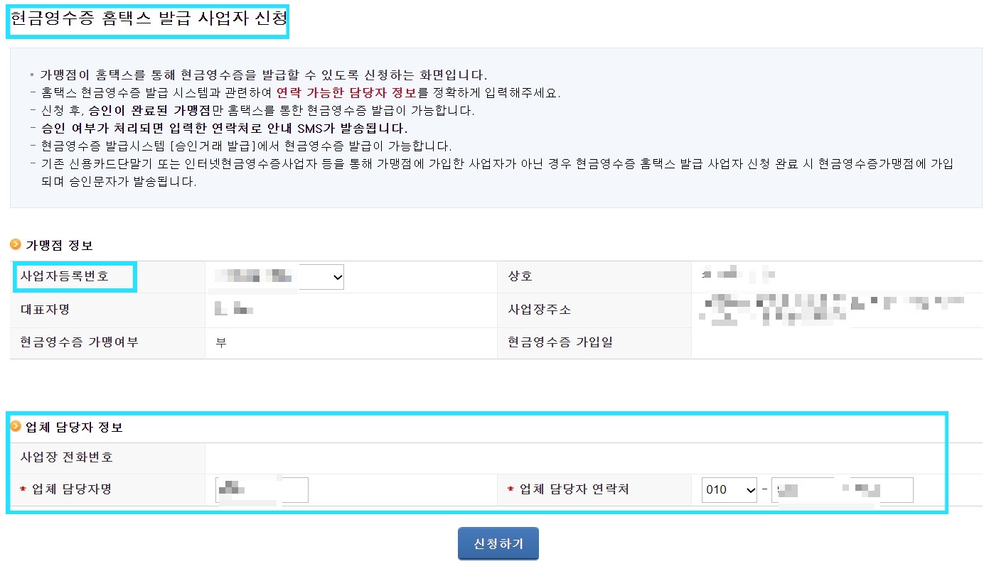 - 신청 후, 승인이 완료된 가맹점만 홈택스를 통한 현금영수증 발급이 가능합니다.