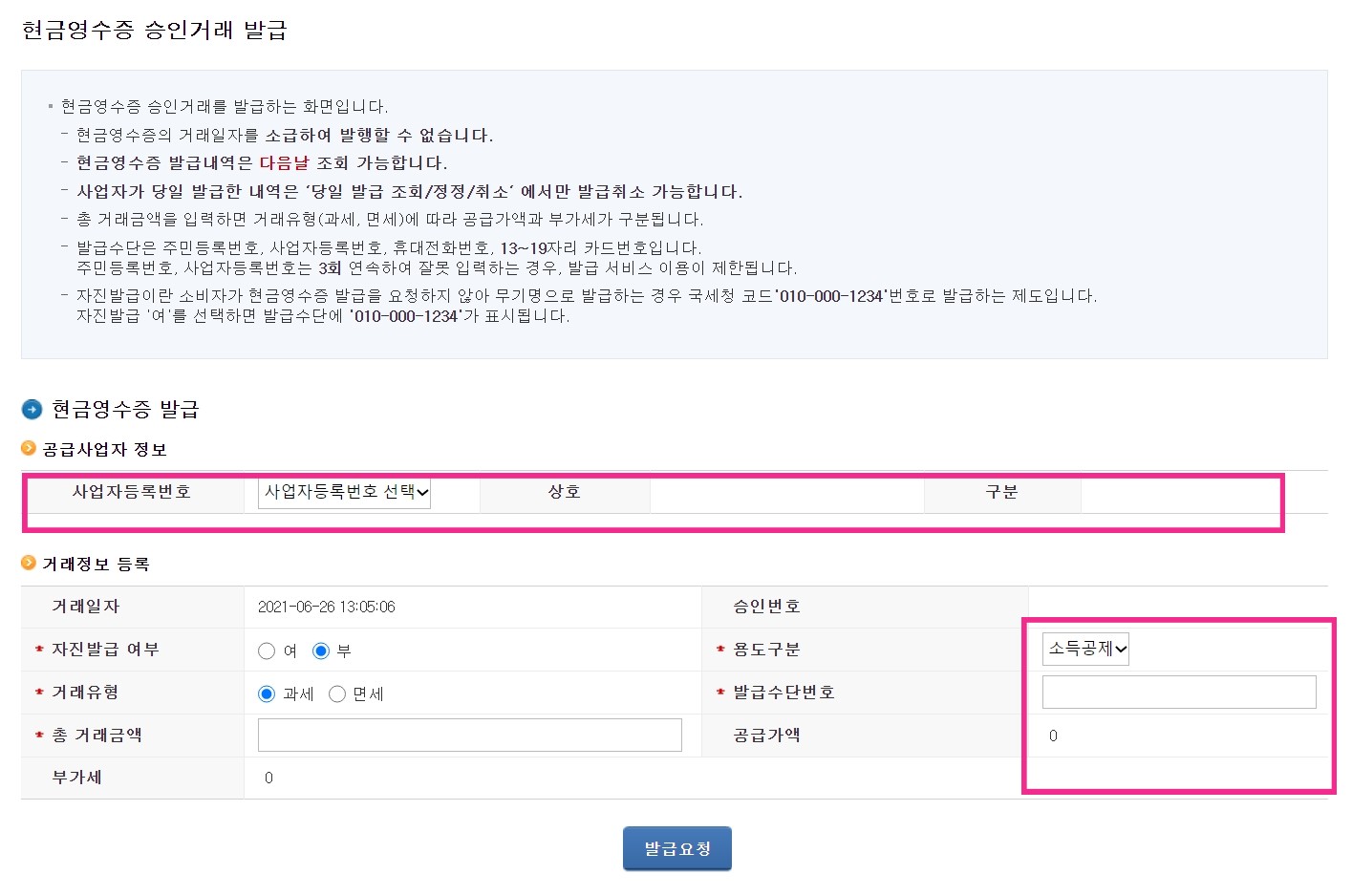 - 현금영수증 발급시스템 [승인거래 발급]에서 현금영수증 발급이 가능합니다.