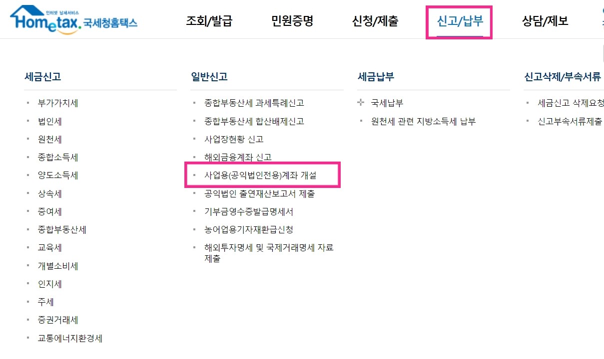 로그인 > 신고/납부 > 사업용(공익법인전용)계좌 개설