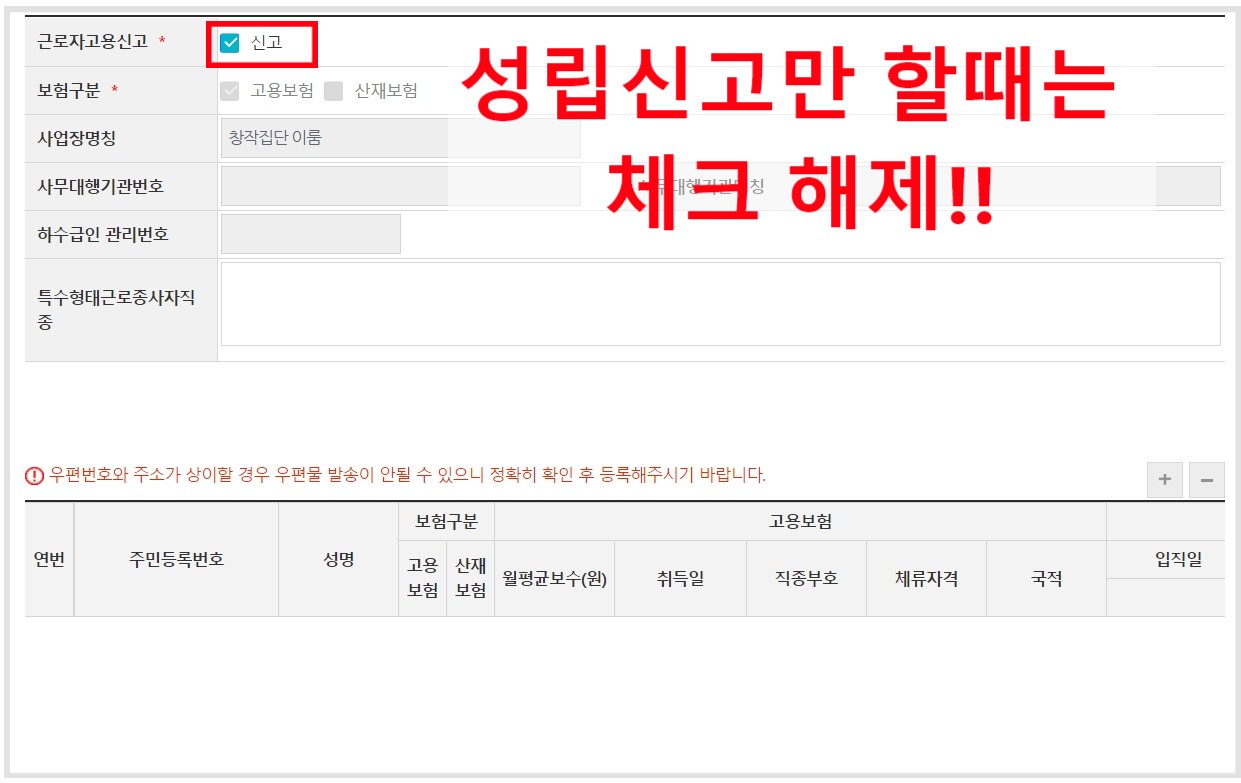 근로자고용신고 부분의 체크를 해제 하셔야 합니다!!