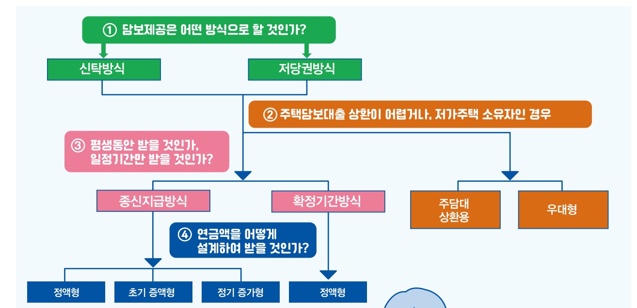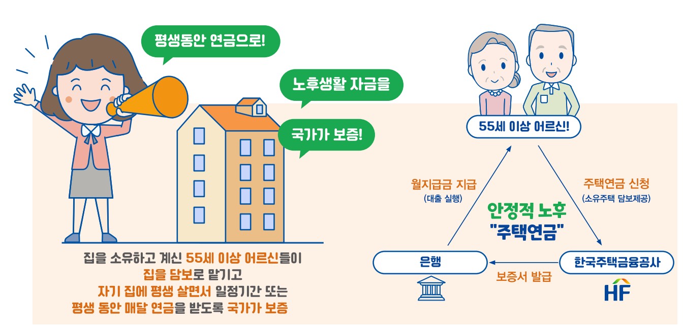 집을 소유하고 계시지만 소득이 부족한 어르신들이 평생 또는 일정기간 동안 안정적인 수입을 얻으실 수 있도록 집을 담보로 맡기고 자기 집에 살면서 매달 국가가 보증하는 연금을 받는 제도입니다.