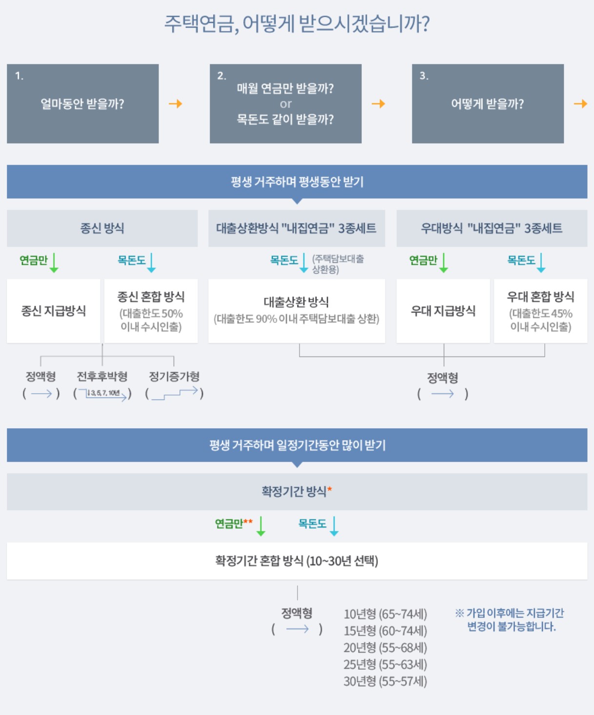 - 종신지급방식 : 인출한도 설정 없이 월지급금을 종신토록 지급받는 방식