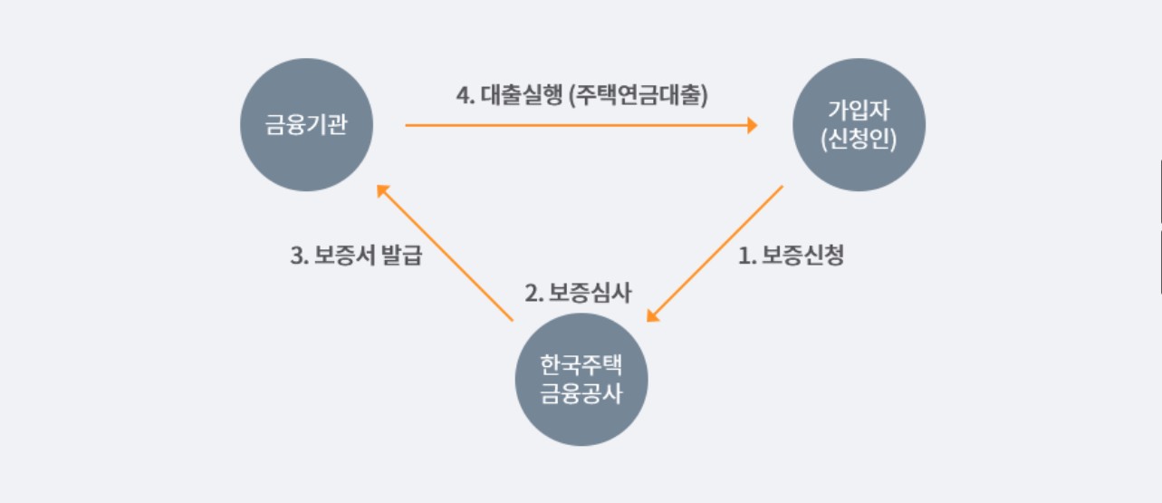 - 이를 위하여 공사는 연금 가입자를 위해 은행에 보증서를 발급하고 은행은 공사의 보증서에 의해 가입자에게 주택연금을 지급합니다.