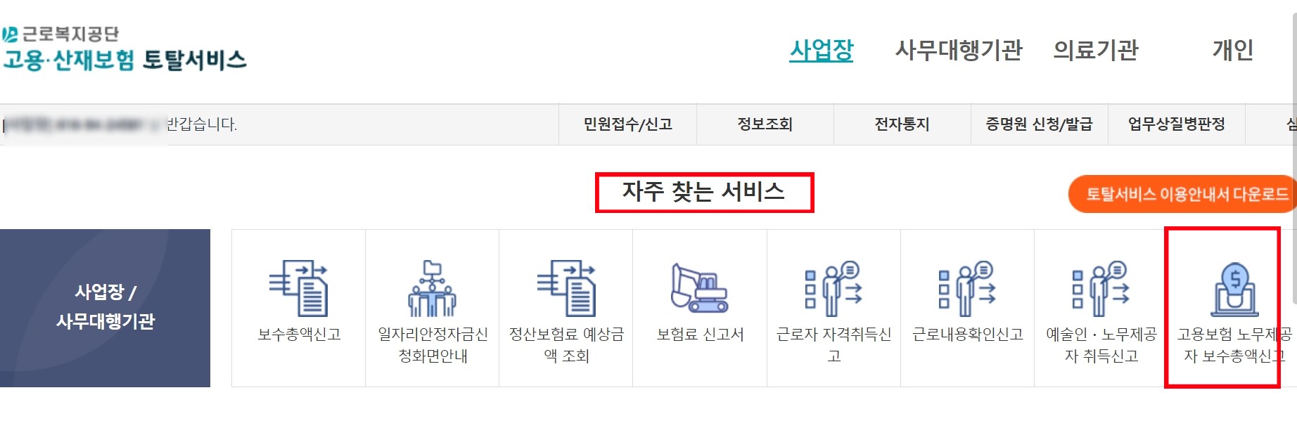 보수총액 신고서 처리가 완료되면, 토털 서비스를 통해 정산보험료 예상금액이 확인 가능합니다.