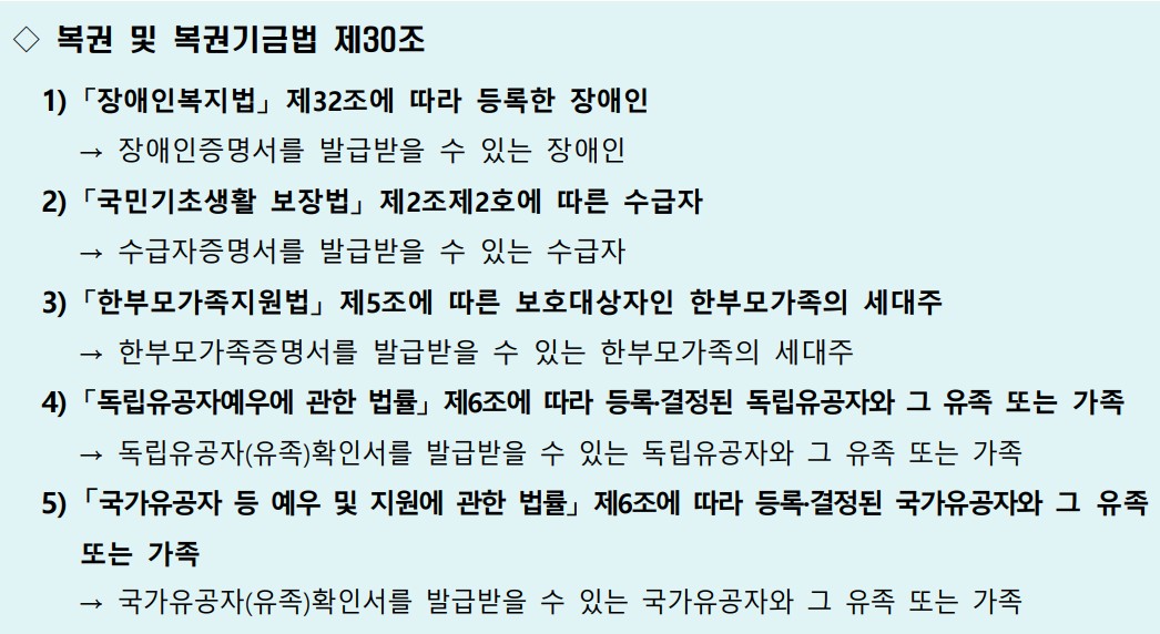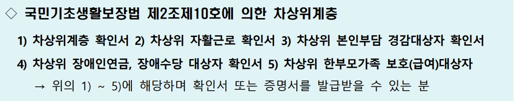 - 장애인증명서, 수급자(차상위계층) 및 한부모가족 증명서 : 지역 행정복지센터 및 복지로 홈페이지