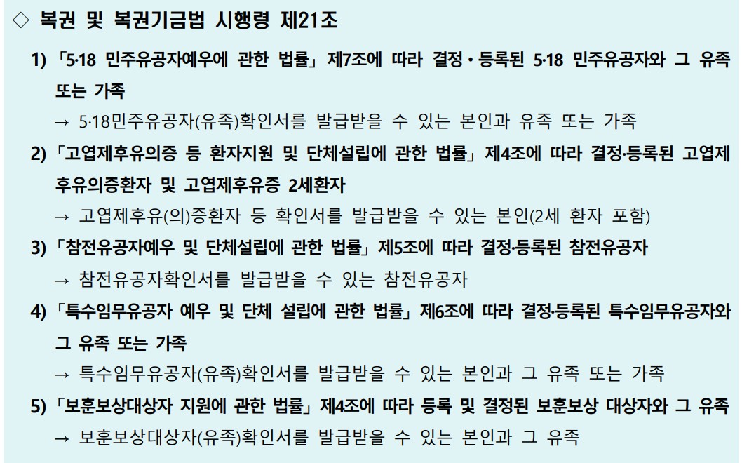 - 국가유공자 관련 확인서(증명서) : 각 지역 보훈처 및 정부24시 홈페이지