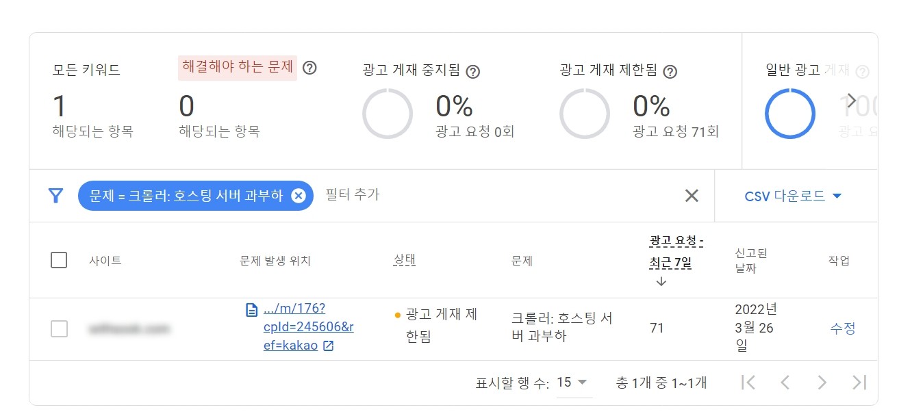 구글 애드센스 보고서에 나온 문제 해결 버튼을 누른 후