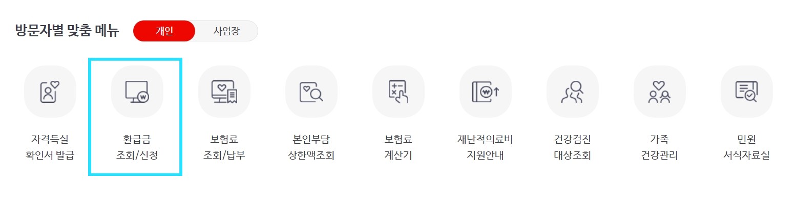 보험공단 홈페이지에 들어가면 딱! 맞춤 메뉴에 '환급금 조회/신청'이 있습니다.