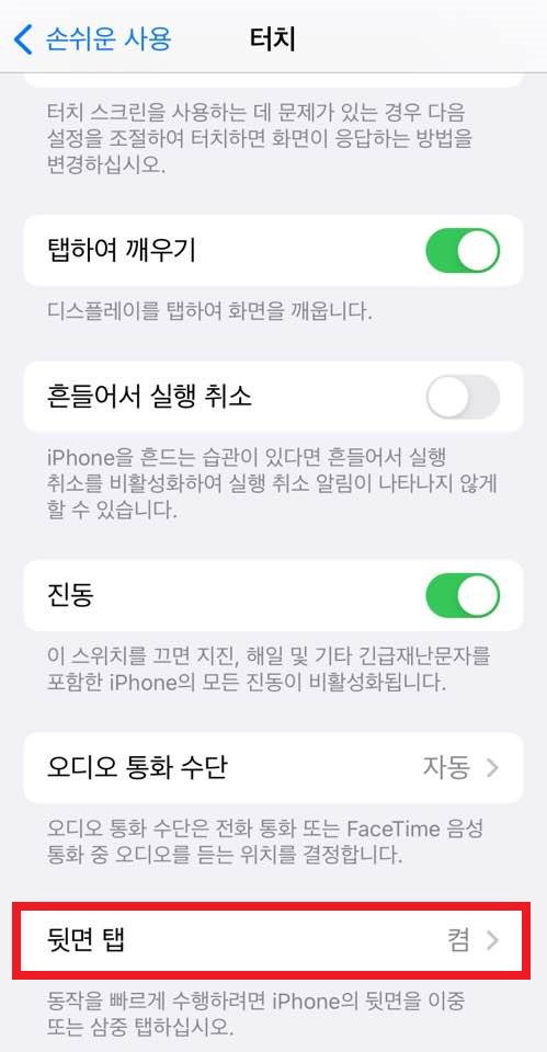 [터치] 화면에 가시면 맨 아래쪽으로 스크롤합니다. 그러면 [뒷면 탭]이 대부분 [끔]으로 되어있을 겁니다. 저는 기능을 사용하고 있기 때문에 제가 캡처한 화면은 [켬]으로 되어있습니다.