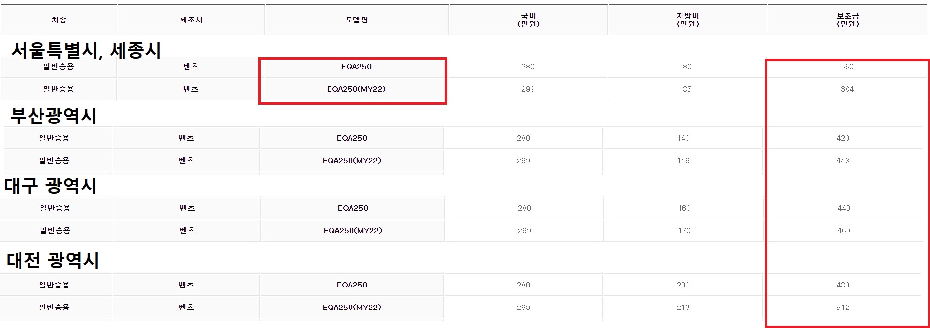 | 서울시, 세종시 | EQA250 EQA250(MY22) |
