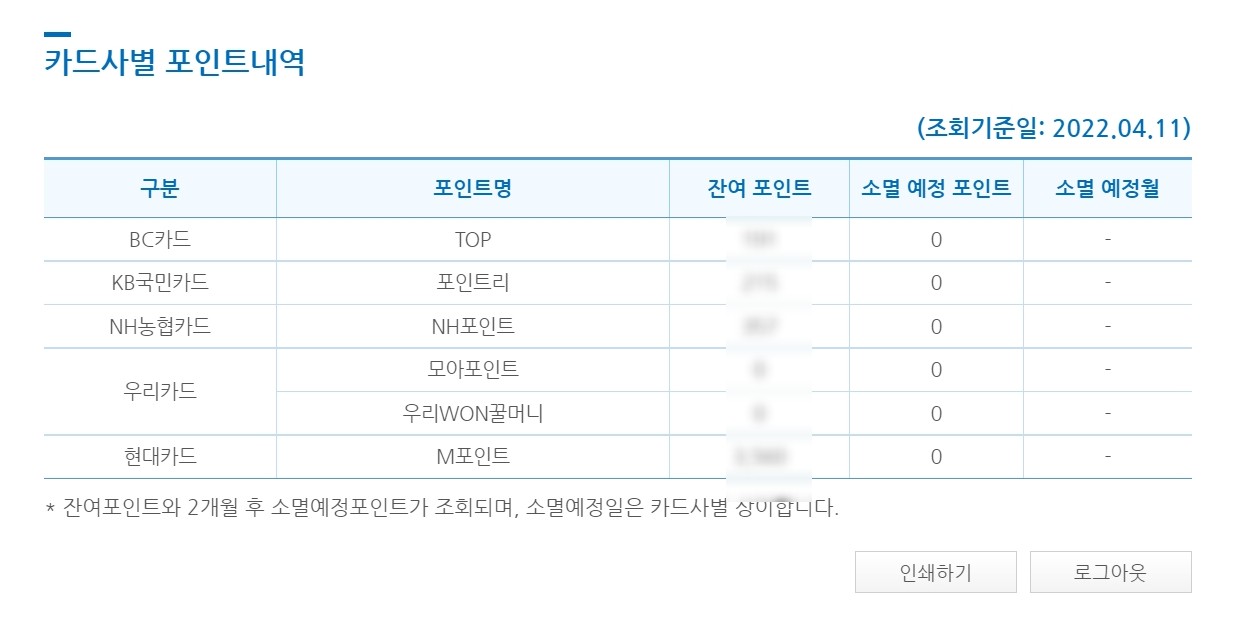 내 카드의 포인트가 조회됩니다. 정말 미비하지만 카드 포인트사에서는 사용할 수 없는 수준이기 때문에 그냥 나의 계좌에 현금으로 받아야겠습니다.