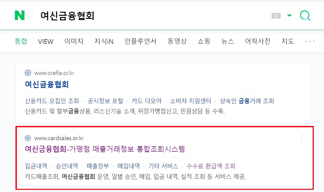 그러면 맨 위 상단에 2개의 사이트가 뜹니다. 첫 번째 여신금융협회가 아닌 두 번째 [여신금융협회-가맹점 매출거래정보 통합조회시스템]에 들어갑니다. 사이트명이 너무 길지요? 그냥 검색 결과에서 두 번째 사이트에 접속합니다.