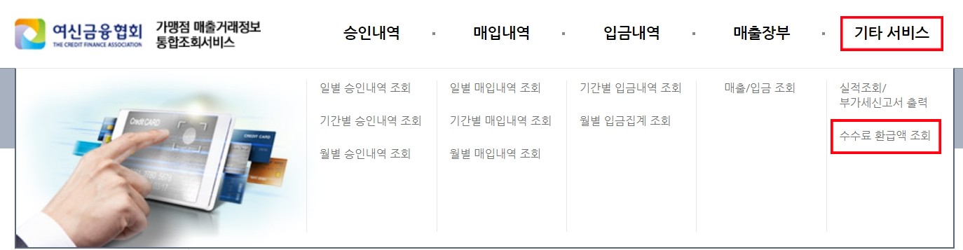 여신금융협회라는 곳에서는 다양한 서비스를 이용할 수 있습니다. 소상공인들에게 필요한 신용카드매출매입 내역, 카드 포인트 조회, 그리고 오늘 중요하게 알아볼 카드 수수료 환급액 조회가 있으니 적극 활용하시기 바랍니다.