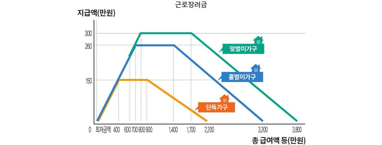 내가 1년 동안 적게 벌었다고 해서 많이 받는 것이 아닙니다. 1년 동안 소득액이 어느 일정 구간 안에 들어와 있어야 근로장려금의 최대 금액이 산정되어 지급됩니다.