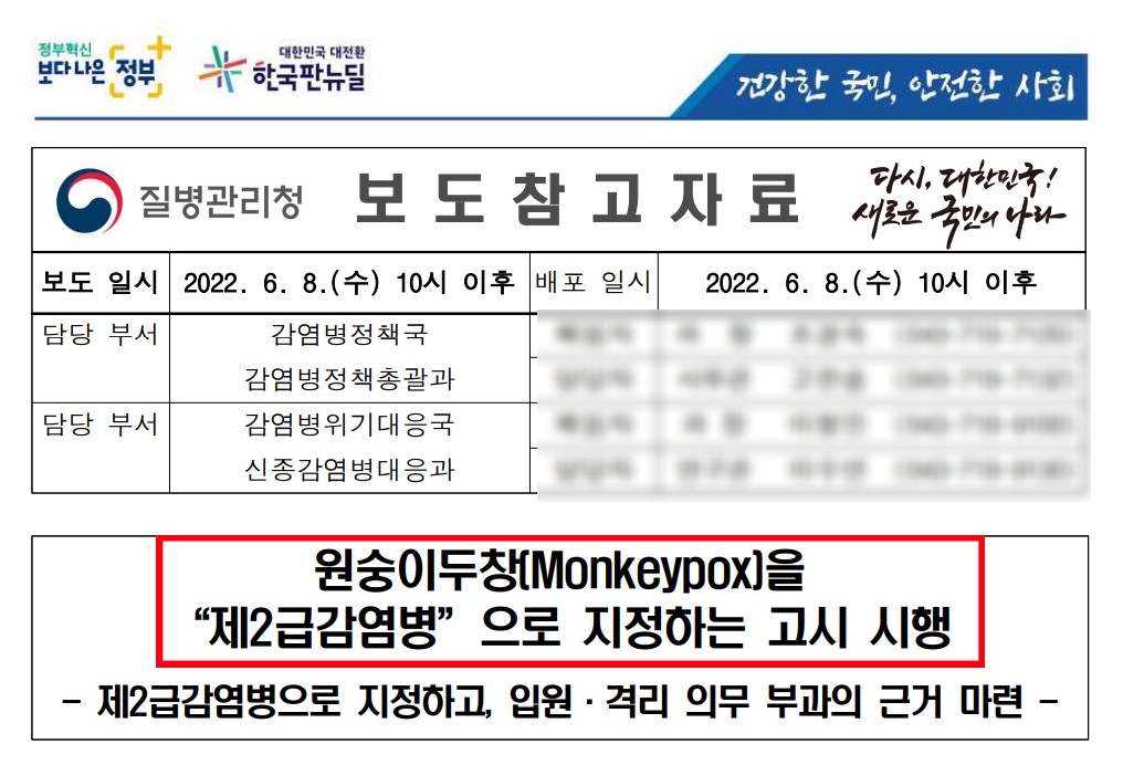 질병관리청에서 6월 8일 "원숭이 창"을 제2급 감염병이라고 지정하였습니다. 이제 "원숭이두창"에 감염되면 치료 및 격리 의무가 부여됩니다.