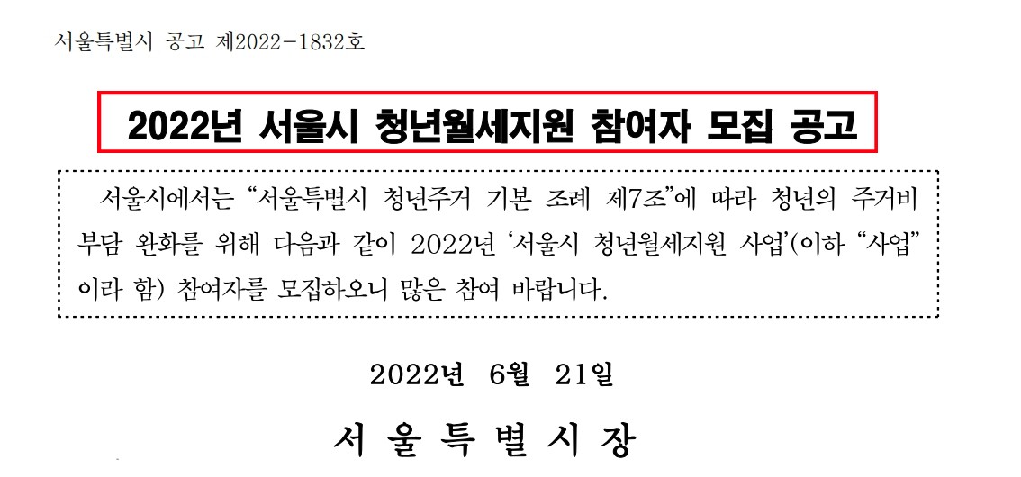 6월 28일(화) 10시부터 7월 7일(목) 오후 6시까지 서울주거포털 ‘청년 월세 지원’ 란에 온라인으로만 신청 및 접수가 가능합니다. 서울시에서는 2만 명을 예상하는데 예산이 확보되면 3만 명까지 늘어날 수 있습니다.