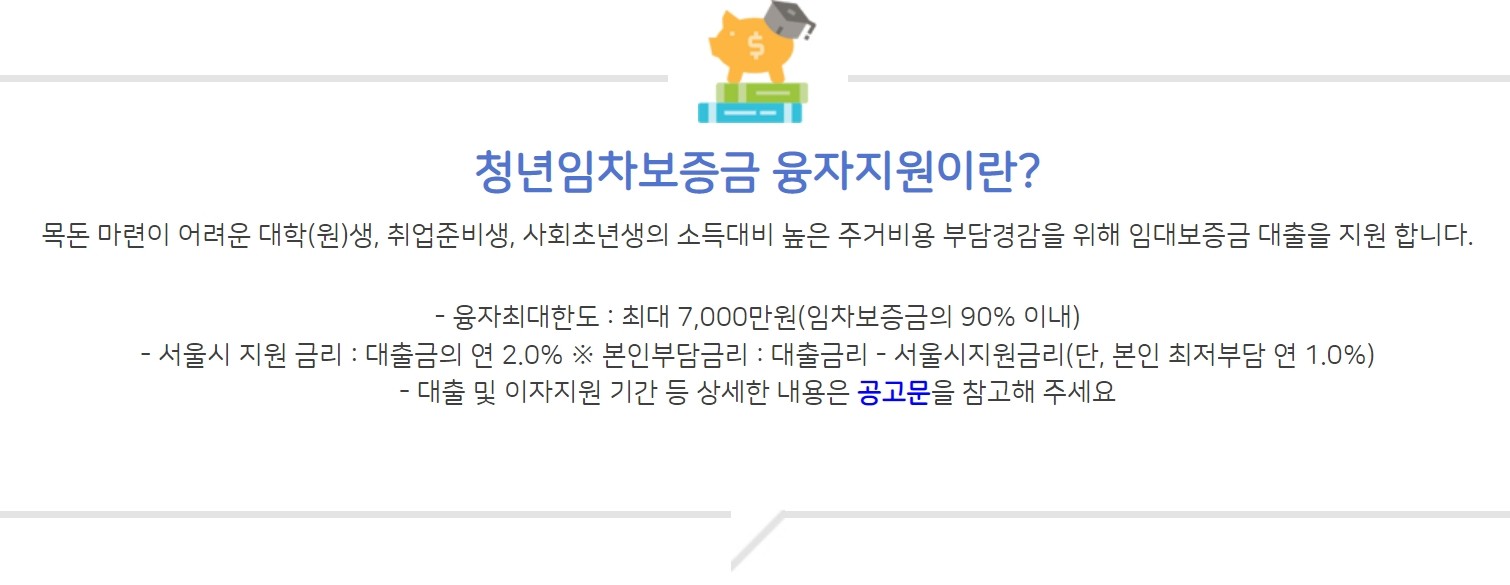 목돈마련이 어려운 대학생, 취업준비생, 사회초년생의 수입은 현실적으로 낮을 수밖에 없습니다. 게다가 서울에는 다른 지역보다 기본적으로 높은 보증금으로 집을 얻어야 하기 때문에 주거비에 대한 부담이 많습니다. 이에 서울시에서 융자를 지원해주어 대출금리를 낮게 하는 사업을 말합니다.