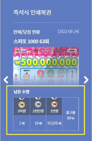 보시면 출고율이 99%라는 것은 '스피또 1000' 즉석복권 63회의 판매 출고가 99%라는 것입니다. 저는 여기서 1등인 5억 원이 1매만 나온 줄 착각했습니다. 보시면 남은 수량을 알려주는 것입니다.