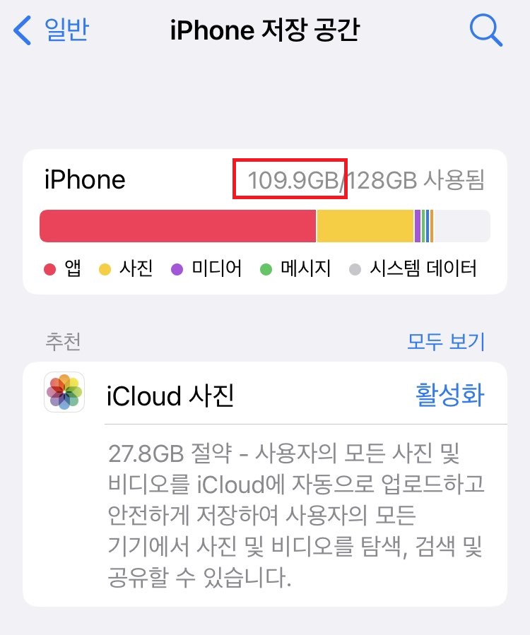 가장 기본적인 체크사항입니다. 아이폰도 컴퓨터처럼 저장공간이 부족해도 느려집니다.