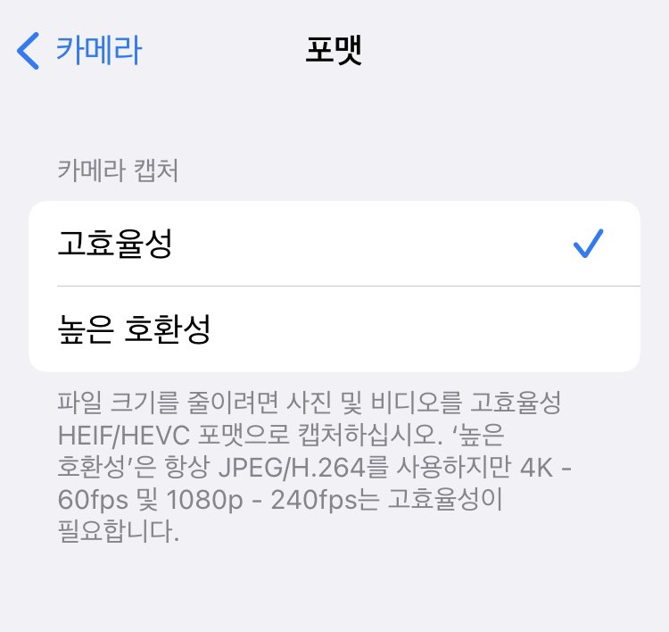 아이폰의 기본 카메라 포맷은 '높은 호환성'으로 체크돼있습니다. 이것을 '고효율성'으로 변경하시면 됩니다. 필요한 경우에만 높은 호환성으로 설정해서 찍으시고 평소에는 '고효율성'으로 설정해서 사용하시면 됩니다.