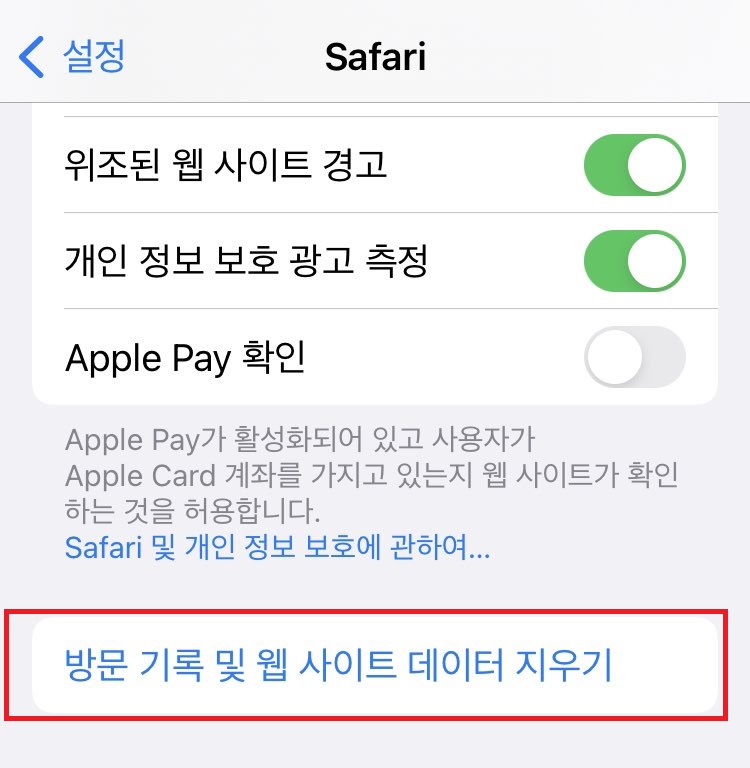 설정 → 사파리(Safari) → 방문 기록 및 웹 사이트 데이터 지우기