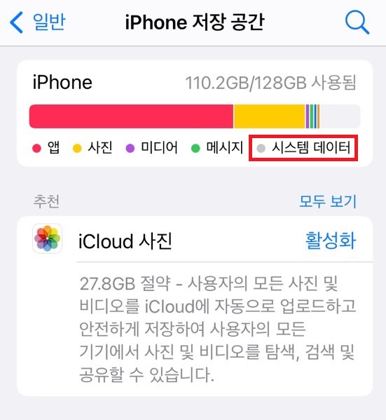 아이폰에서 저장공간을 확인하면 대부분 앱, 사진, 메시지에 사용되는 것을 볼 수 있습니다. 그리고 '기타'란 이름으로 저장 섹션이 나옵니다. 현재는 '시스템 데이터'로 표기됩니다.