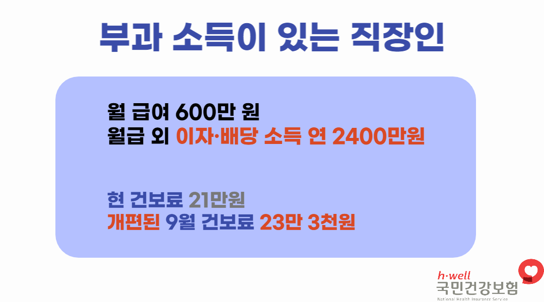 기존에는 보수(월급) 외 소득액이 3,400만원 초과 시 초과되는 부분에 대해 보험료가 부과되었으나, 개편된 9월에는 월급 외 소득이 2000만 원이 넘으면 그 초과분에 대해 보험료가 올라갑니다.