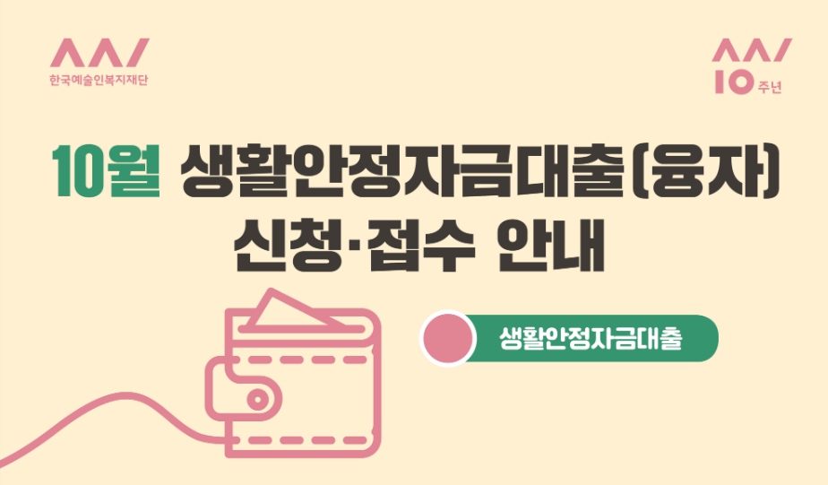 한국예술인복지재단에서 예술인들이 생활상의 어려움을 이겨내고 창작활동에 매진할 수 있게 '예술인 생활안정자금(융자)' 사업을 시작했습니다. 이번 10월에 '생활안정자금' 시행으로 예술인 분들이 저금리로 대출을 받을 수 있으니 신청하시기 바랍니다.