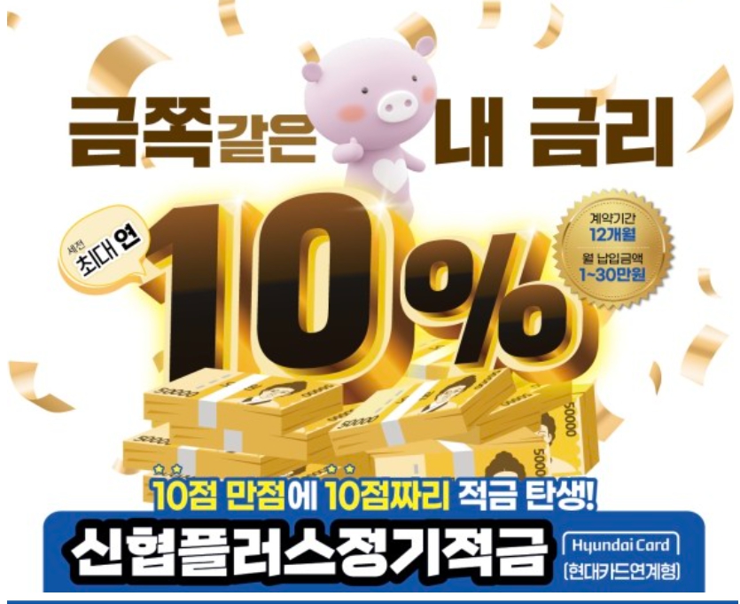 금융권에서 고금리 적금을 이벤트 상품으로 출시하고 있습니다. 이번에 신협중앙회와 현대카드가 함께 연계형으로 출시한 플러스 정기적금 상품은 최고 연 10% 금리를 제공하고 있습니다. 가입기간이 긴 만큼 희소식이 아닐 수 없습니다.