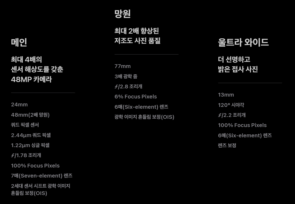 이번 아이폰의 외향으로 확실하게 다른 점은 압도적인 디테일을 자랑하는 혁신적인 48MP 카메라입니다. 첨단 쿼드 픽셀 센서를 탑재한 메인 카메라로 프로처럼 사진을 찍을 수 있습니다.