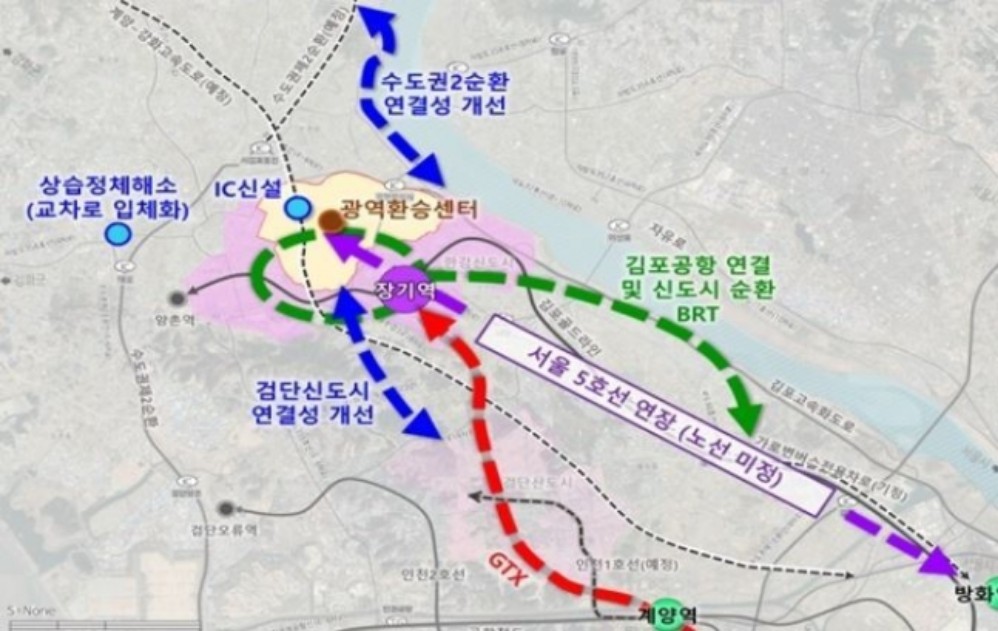 정부는 김포한강2지구 내에 5호선 역을 신설하고 장기역과 연결하는 방안을 제시했습니다. 또한 경기도 김포시에 4만6천호 규모의 신도시급 신규 택지가 조성될 예정입니다.