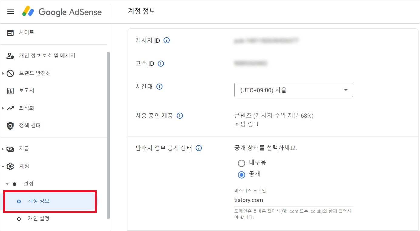 2. 구글 애드센스 계정 정보를 확인합니다.