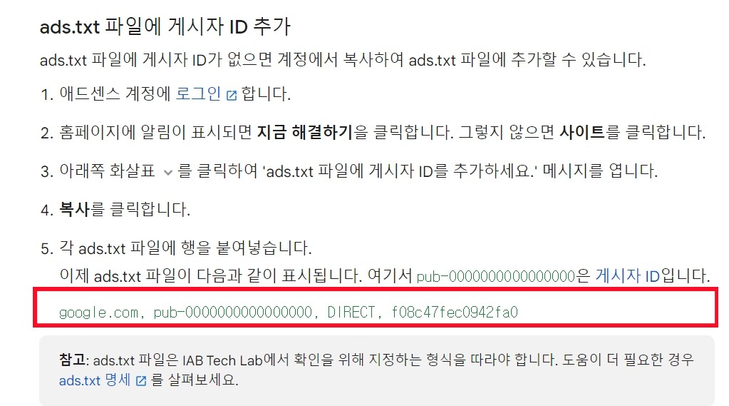 구글에서 원하는 승인된 정보가 필요합니다. 구글 애드센스 'ads.txt 가이드'에 따르면, 구글 애드센스 승인된 코드가 필요합니다. 이거 시은 본인의 게시자 ID라고도 불립니다.