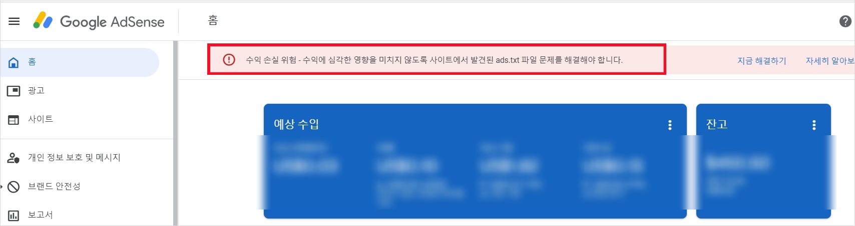 '수익 손실 위험-수익에 심각한 영향을 미치지 않도록 사이트에서 발견된 ads.txt 파일 문제를 해결해야 합니다.'