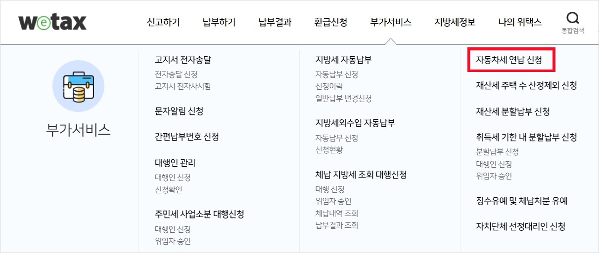 지방세를 납부하는 사이트인 '위택스'에 가면 [부가서비스]-[자동차세 연납 신청] 화면에서 자동차세 연납 신청이 가능합니다.