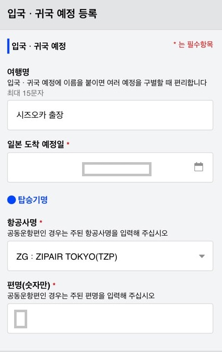 여기에서 필요한 정보는 일본 탑승기 항공사명입니다. 항공사랑 편명을 등록하셔야 합니다.