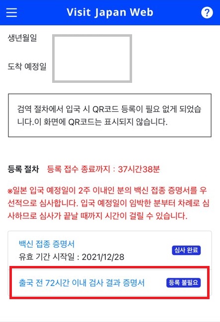 그러면 백신접종증명서 심사완료와 결과증명서도 등록불필요라고 파란색으로 뜹니다. 현재 일본 입국 시 코로나 검사 결과 증명서는 필요 없습니다.