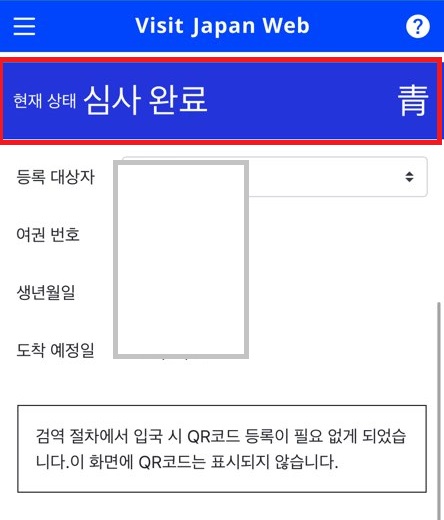 검역절차 사전등록 화면이 파란색으로 변하고 심사완료 상태로 바뀝니다. 다만 예전처럼 QR코드 등록이 필요 없기 때문에 QR코드는 표시되지 않으므로 위 이미지만 캡처해 놓으시면 됩니다.