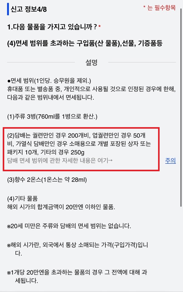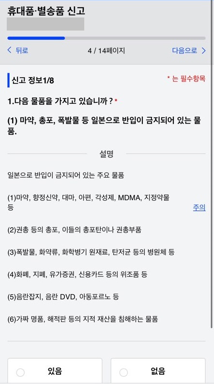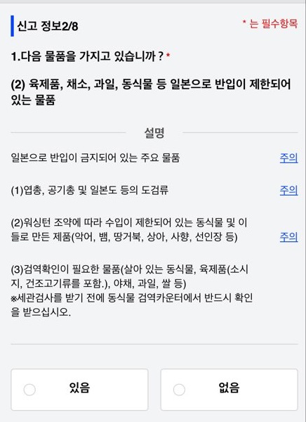 이 부분부터는 간편합니다. 위에서 미리 등록했던 내용이 그대로 뜨기 때문에 확인만 잘하시면 됩니다. 그리고 어느 나라나 똑같은 세관신고인 불법을 하지 않았음을 확인하시면 됩니다.